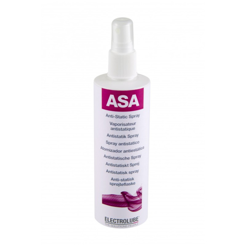 Anti-Static Spray je velmi účinný čistič navržený k odstranění prachu a zabránění hromadění statické elektřiny. ASA je speciálně vyvinut pro použití v oblastech, kde statický náboj způsobuje problémy, např. počítačové místnosti a kanceláře, je vhodný pro použití na plasty, kovy, sklo a syntetické povrchy. Byl sestaven pro aplikace bez skvrn.Je vhodný pro použití na textilie a jakékoliv barvy. Baleno v čerpadlovém spreji a je určen pro použití na pracovištích, kde přísné bezpečnostní předpisy zakazují použití hořlavých rozpouštědel a aerosolů, např. doly, ropné-stroje, ponorky a letadla.