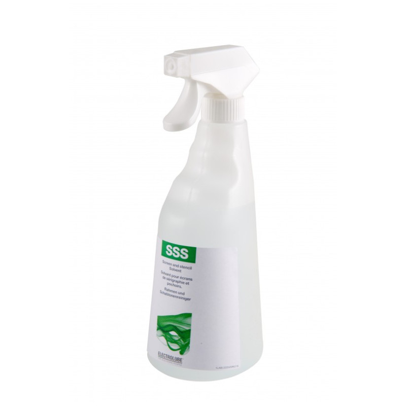 Electrolube SSS čistič je velmi účinný čistič na bázi rozpouštědel , který je klasifikován jako nehořlavý. Vykazuje vynikající výsledky při odstranění pájecích past a lepidel . SSS je rozpustný ve vodě a proto vhodný pro použití v automatických čistících systémech na šablony a pro jinou čisticí a úklidovou techniku. SSS je k dispozici ve velkých baleních pro použití v automatizovaných systémech a v 500ml sprejové nádobě pro ruční použití.