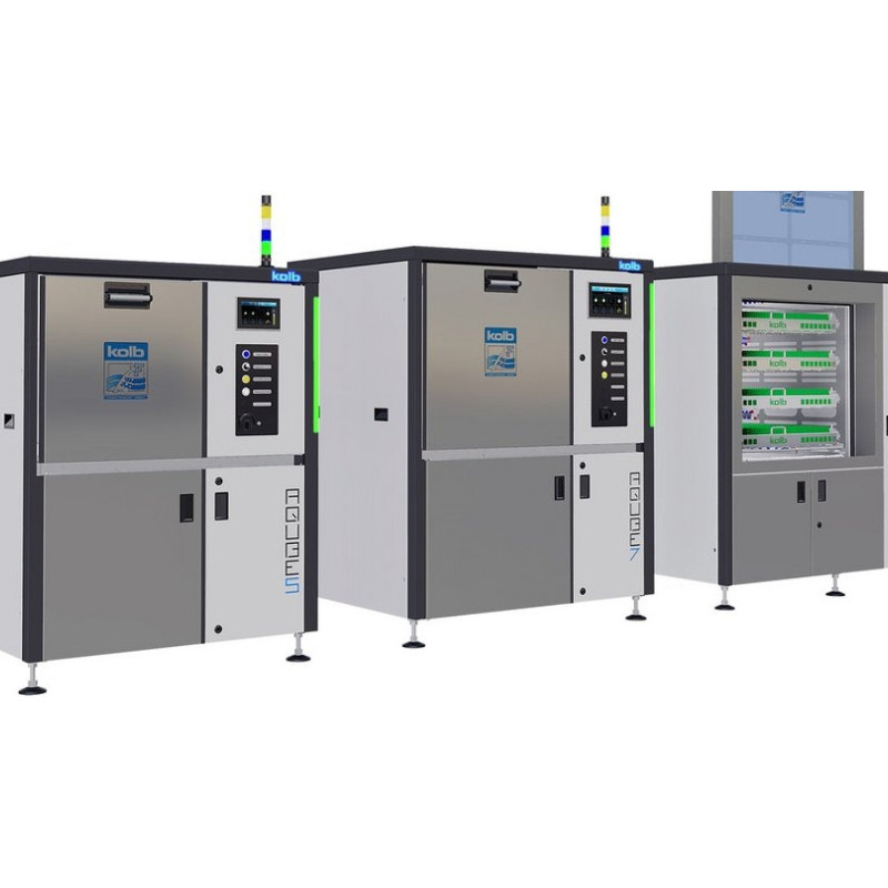 The systems of the kolb AQUBE® XH series offer ultra fine cleaning for highest demands such as the process safe cleaning of DCBs, PCBs, SiPs, HDI boards, hybrids and misprints from contaminations such as fluxes, rosin, resin, copper, Cu oxide and solder-support substances. AQUBE® XH systems clean up to 830 (19 m²) eurocards in up to four variable horizontal drawer baskets (relative cleaning time per board: approx. 6.5 seconds).