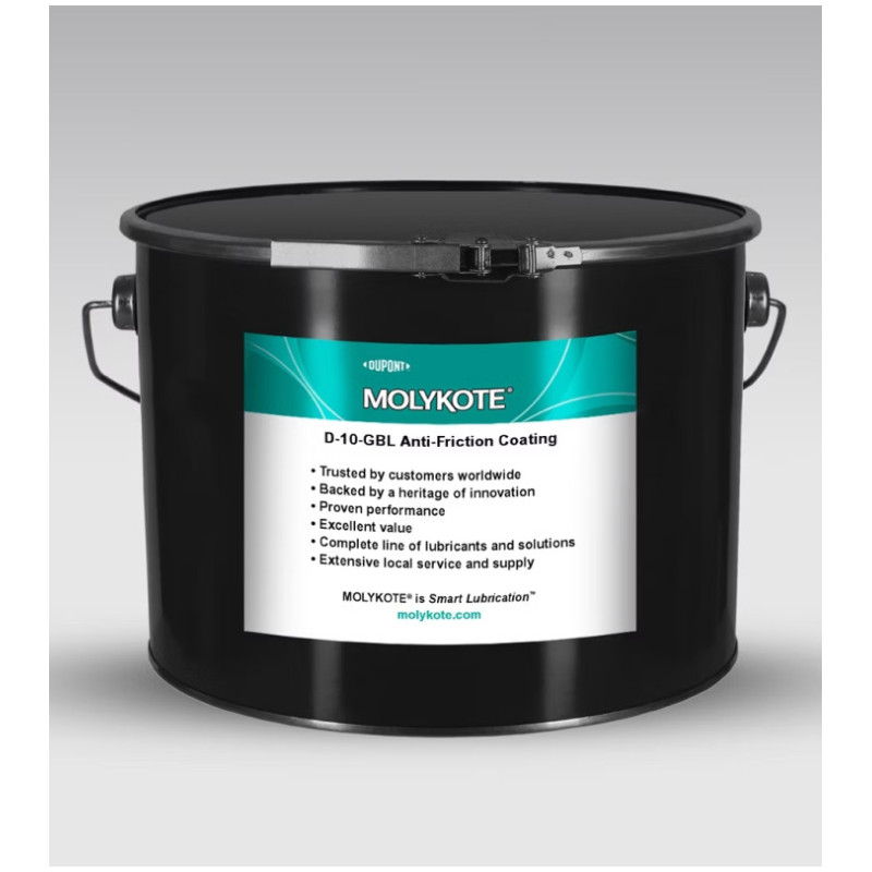 Molykote D-10-GBL Anti Friction Coating is a heat cured anti-friction coating filled with graphite. It is best suited for metal/metal combinations involving slow to medium speeds and low to medium loads. Suitable for the permanent lubrication of heavily loaded friction contacts involving low to high speeds, in direct contact with motor oils, gasoline, diesel or Grease. Used in automotive applications like pistons of internal gasoline and diesel combustion engines, compressors and piston pumps, pneumatic and hydraulic systems; and other applications that require help to reduce piston and cylinder wall wear during break-in, cold-start and ongoing operation situations.