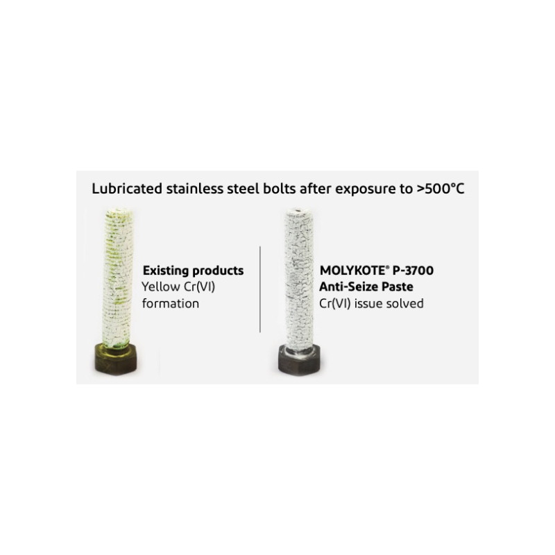 MOLYKOTE P-3700 Anti-seize Paste (protizáděrová pasta) je vysoce čistá, tuhá mazací pasta pro šroubové spoje, neobsahující záměrně přidaný vápník, olovo, nikl, síru, chlor ani fluor. Úspěšně potlačuje tvorbu žlutavého šestimocného chromu za vysokých teplot a zároveň nabízí plně funkční protizáděrové vlastnosti.