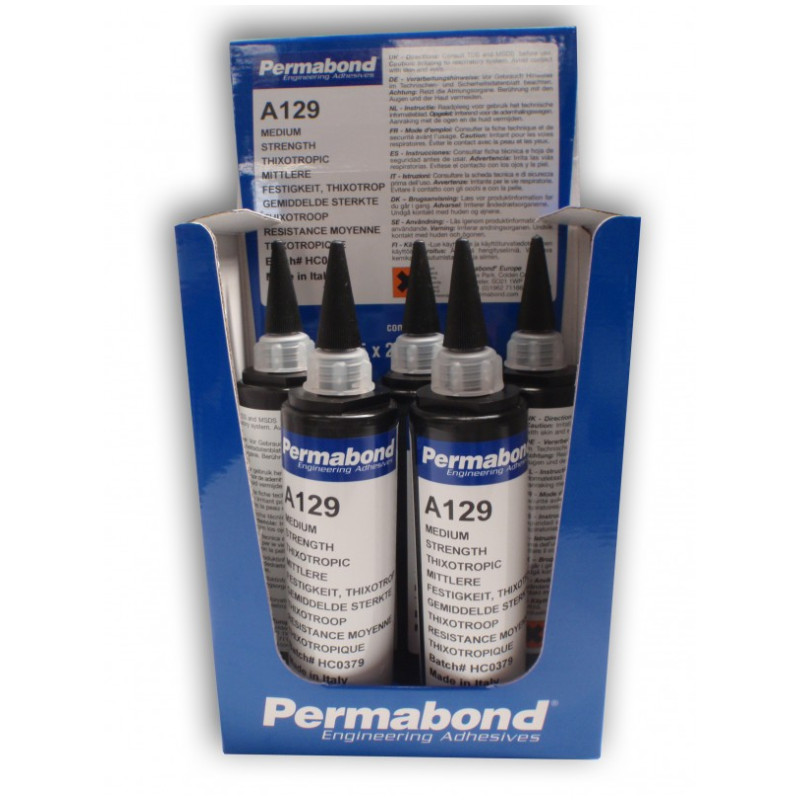 Permabond A129 je středněpevnostní tixotropní (nestékavé), anaerobní lepidlo.Je speciálně navržené pro použití na hrubé závity. Vzhledem k jeho viskozitě a jeho pevnostní charakteristice může být také použito jako přírubové těsnění nebo pro lepení válcových spojů. Jeho střední síla také znamená, že spoje mohou být demontovány při údržbě s pomocí běžných nástrojů.