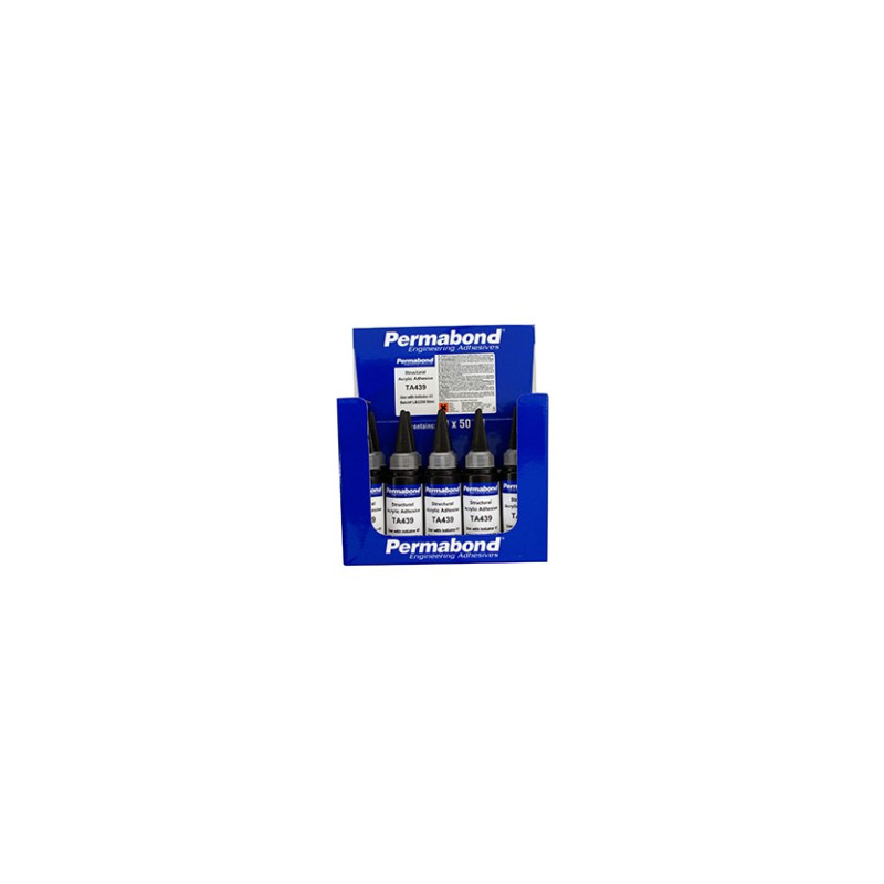 Permabond ® TA439 je dvousložkové strukturální akrylické lepidlo určené především pro lepení kovů, feritů, keramiky a některých plastů.Typická doba pro fixaci dílů je 10-30 sekundy. Krátký fixační čas TA439 činí z tohoto lepidla ideální produkt pro použití ve výrobních linkách. Tento produkt poskytuje vysokou pevnost, tuhost, trvanlivý spoj s dobrou odolností proti nárazu a funguje dobře i při zkouškách pádem. TA439 je bez obsahu kyseliny methakrylové, to znamená, že je vhodný pro použití v uzavřených elektrických motorech a nezpůsobí korozi citlivých komponentů.