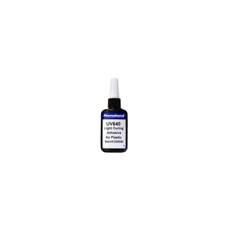 Permabond UV640 je jednosložkové, rychlé vytvrzující UV lepidlo určené speciálně pro lepení plastů. Tento materiál má vynikající přilnavost k různým plastům včetně polykarbonátu. Permabond UV640 má velmi vysokou pevnost ve smyku, tažnost a odolnost proti nárazu, takže je ideální pro aplikace, které vyžadují lepené materiály s různými koeficienty tepelné roztažnosti.