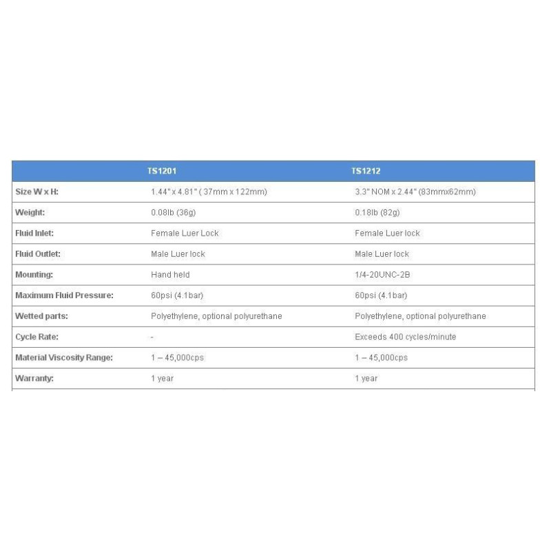 The only part of the valve making contact with the fluid being dispensed is the disposable pinch tube assembly making the TS1212 and TS1201 ideally suited to dispensing 2-part and CA (Cyanoacrylate) materials.