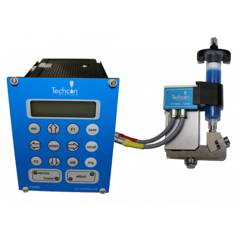 The TS9000 Series Jet Tech is a Piezoelectric driven, non contact dispense valve capable of handling fluid viscosities to 2 million Cps. Jet Tech offers a fast jetting action producing hundreds of accurate deposits less than one second.Every component of the valve was designed to the highest tolerances and manufactured to the strictest degree of precision insuring world class accuracy and repeatability in drop-to-drop dispensing volume. Jet Tech's compact size and modular design aids integration into robotic systems. The valve features fully adjustable parameter settings, allowing the operator to change the jetting properties for different fluid types and optimize the process for repeatable dispensing. A variety of nozzles shape and sizes along with different tappet configurations provides a wide spectrum of output jet deposits.