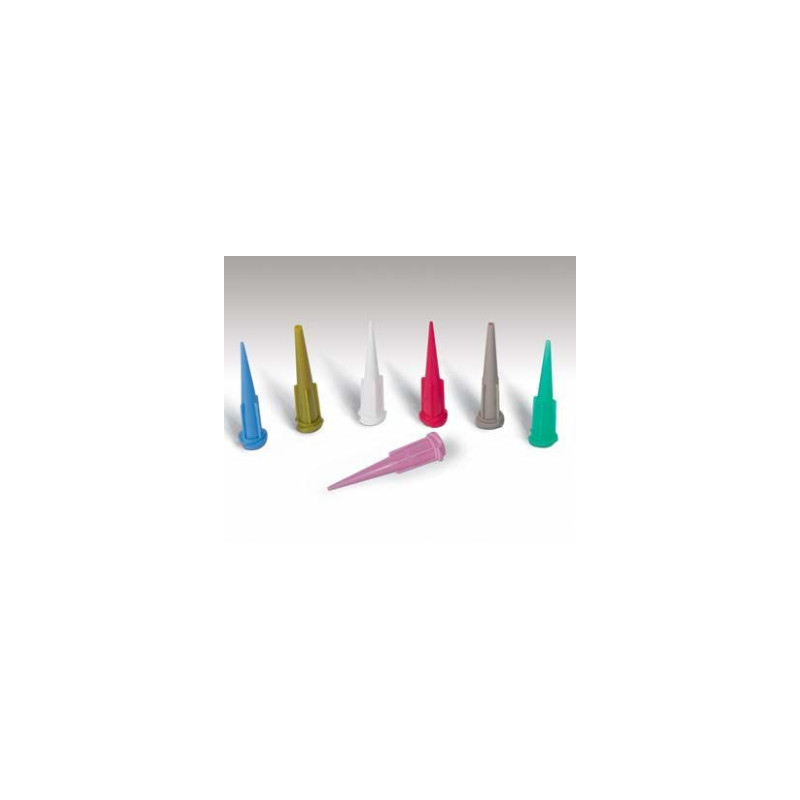 Techcon TT tapered tip series are designed with a double helix threads and universal luer lock to provide secure connection to industrial syringes or dispense valves. The Double Helix TT Series Dispensing Tips are recommended for applications where dispensing medium and high-viscosity fluids with a high degree of precision and consistency is required. A smooth internal fluid path designed reduces turbulence flow, prevents air entrapment and fluid dripping caused by ''back pressure'' built up. The flash free orifice ensures accurate and repeatable dispensing. And for the first time in the industry, the 27-gauge is available to make micro-dots dispensing possible. Standard tapered tip series is made of Polyethylene with UV-light block additive. Rigid tapered tip is recommended for automation applications and is made of Popypropylene with opaque color to provide UV protection. The tapered tip series is silicone and chloride-free with a maximum operating pressure 100psi (6.9bar).