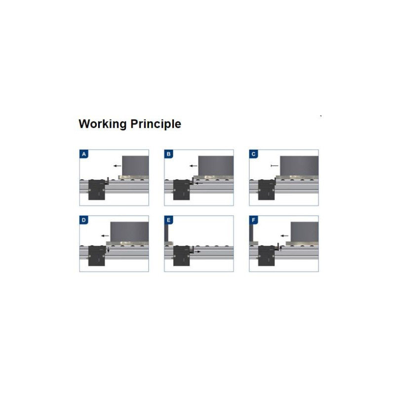 Pallet stoppers fulfill two functions in the assembly of industrial and household goods on palette loop systems: They ensure smooth deceleration of individual or several palettes which have been parked in waiting positions at set line areas in the production process, and forward them individually for transporting to the next manufacturing position. There the palette stopper again ensures a smooth deceleration to avoid damage to the manufactured parts from hard impacts. At the same time it ensures the final position is reached precisely to guarantee correct machined assembly.